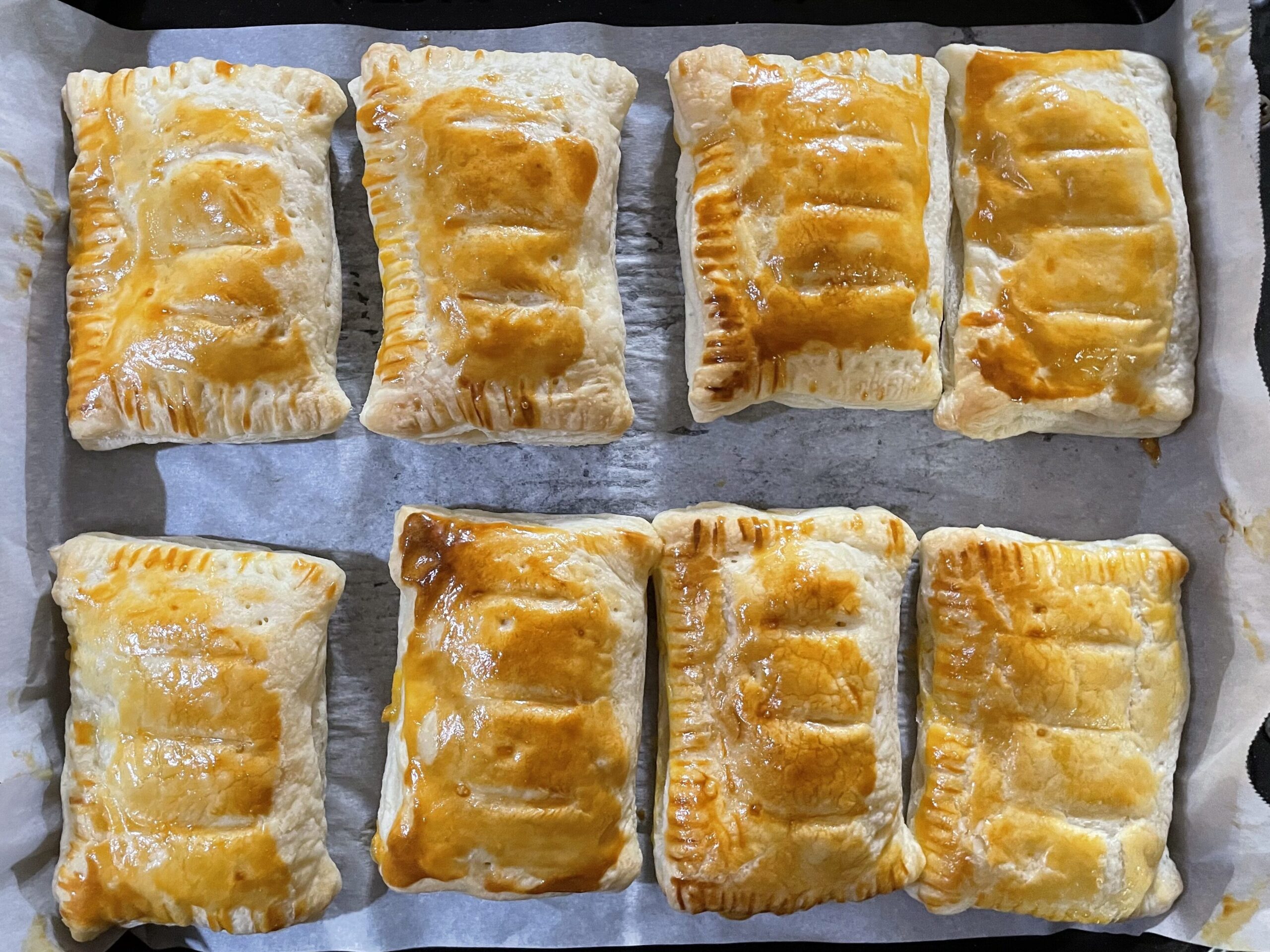 ⑦パイの天面に、短辺と同じ方向で3本切り込みを入れて、卵黄を塗る。